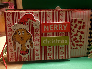 I got the Grinch figures at Michaels on clearance last year. They are foam stickers. The album is made from paper bags. I used up a lot of my Christmas scrap paper. I bound it with an old fashioned binding machine that I use at work for our legal briefs.