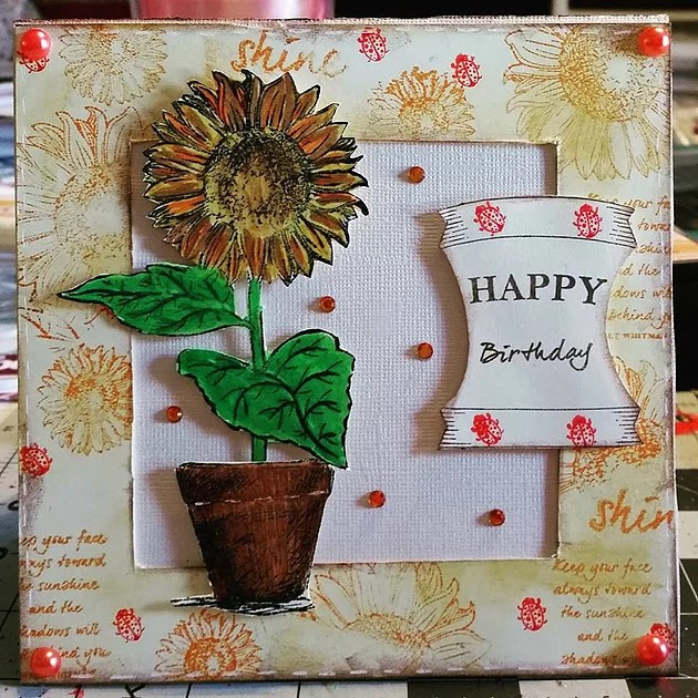 It is a 6 X 6 card. I stamped the background paper with Tim Holtz Distress Ink in Spiced Marmalade and Firebrick Red. The sunflower and planter are colored with Copic Markers and glittery gel pens. Added a little bling and flat back pearls from my stash.